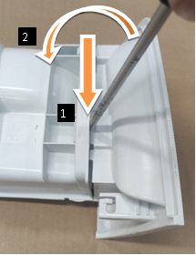 - Appuyez doucement sur la pince à l'aide d'un tournevis (1) et poussez-la (2) pour pouvoir tirer la poignée.