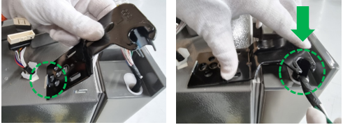 Plaats eerst de scharniergroef in de beugel en druk vervolgens de voorkant naar beneden zodat deze in de bovenste bus past.